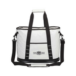The Glacier 45C tarpaulin water-resistant cooler bag with heat-sealed PEVA-insulated lining holds up to 24 cans and features a water resistant, zippered main compartment. It has a front pocket, 2 handles with velcro grip, 2 side carry handles for easy maneuvering and a removable and adjustable, 1 1/2" x 47" padded shoulder strap with swivel clips.